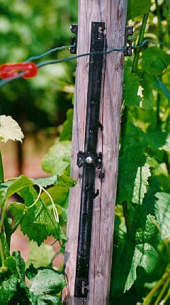 Fæstes på træpæle med 2 skruer. Udslået 300 mm. De unge skud vokser op mellem trådene i